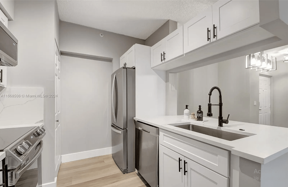 Electrodomésticos en acero inoxidable (nuevos), aire acondicionado (nuevo), gabinetes (nuevos) y encimeras de cuarzo.